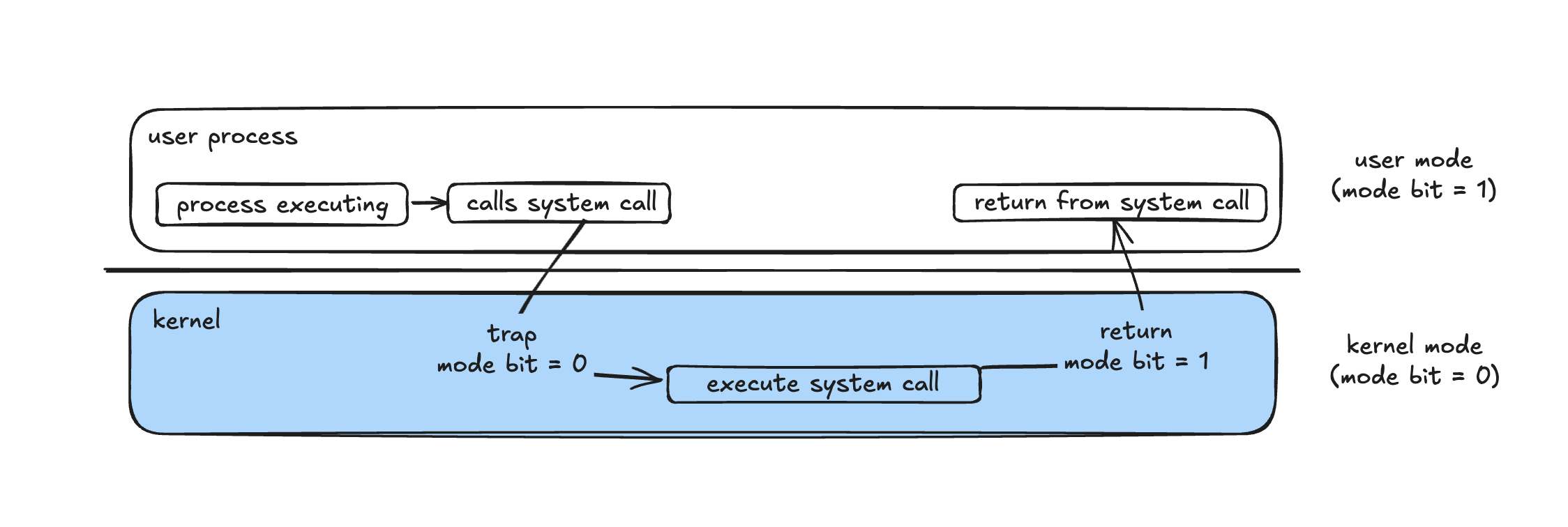 Modern CPUs include a mode bit, a small hardware flag that indicates whether the processor is currently running in user mode or kernel mode.